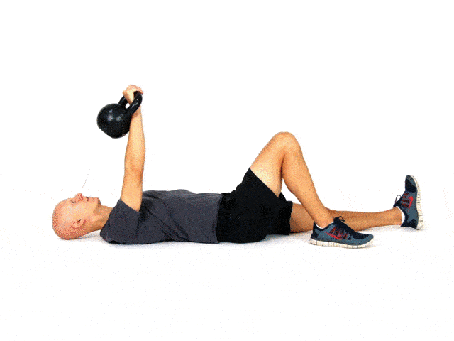 - Prensa de Kettlebell a una Mano: 8 reps por cada brazo. Con el kettlebell en una mano, levántalo hasta el hombro y luego presiónalo hacia arriba hasta que el brazo esté completamente extendido.