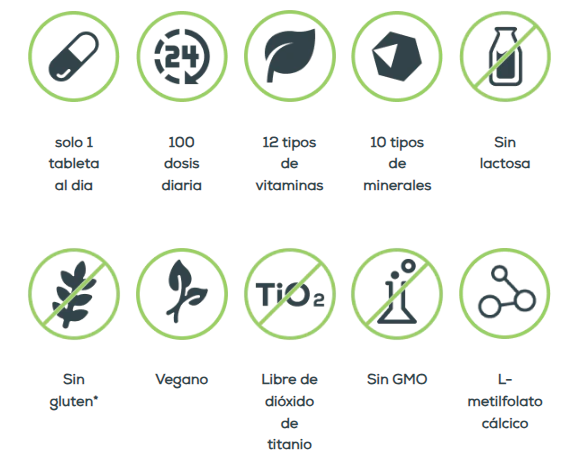 Incluye vitaminas A, C, D, E, B1, B2, B3, B6, B12, ácido fólico, y minerales como zinc, hierro, selenio, cromo y más.